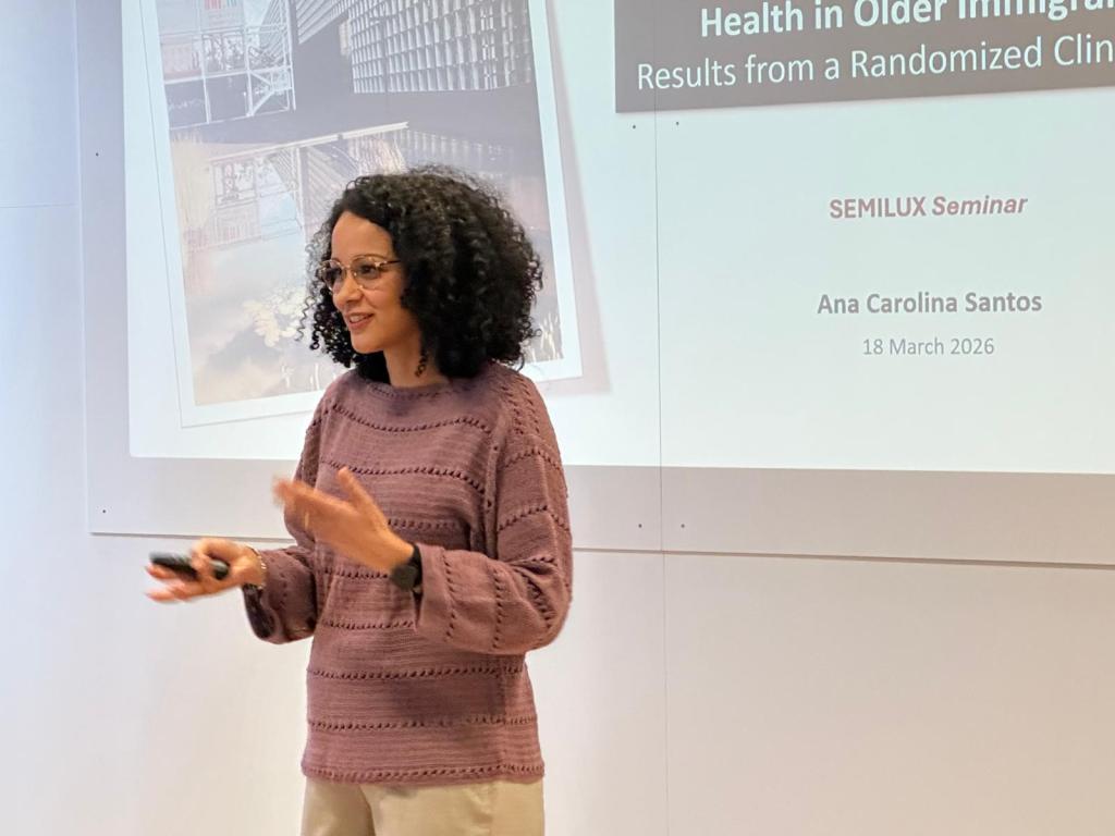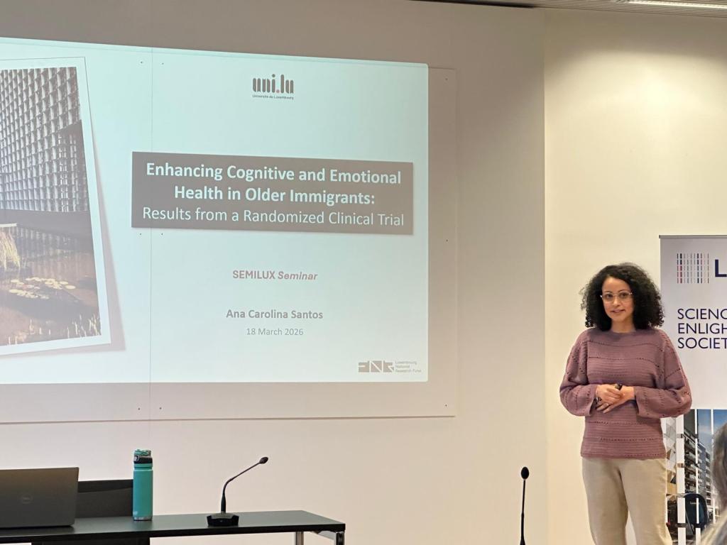 On March 18, Dr. Teixeira-Santos presented her work at the Semilux Seminar on Social Inequality and Public Policies at the University of Luxembourg, titled “Enhancing Cognitive and Emotional Health in Older Immigrants: Results from a Randomized Clinical Trial.”